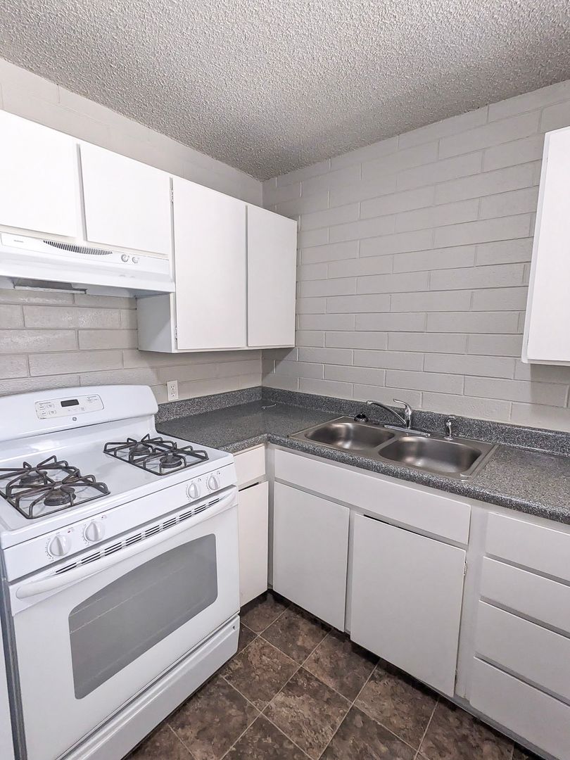 Updated home with functional kitchen featuring gas range, refrigerator, double-basin sink, and white cabinetry. Wood-style plank flooring in the living area with large window for natural light. Bedrooms include soft carpet and spacious closets. Bathroom includes modern vanity and tub with shower surround. Bottom floor unit features a private patio along with extra storage space. Off-street parking and on-site coin-operated laundry available.