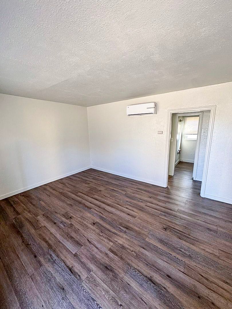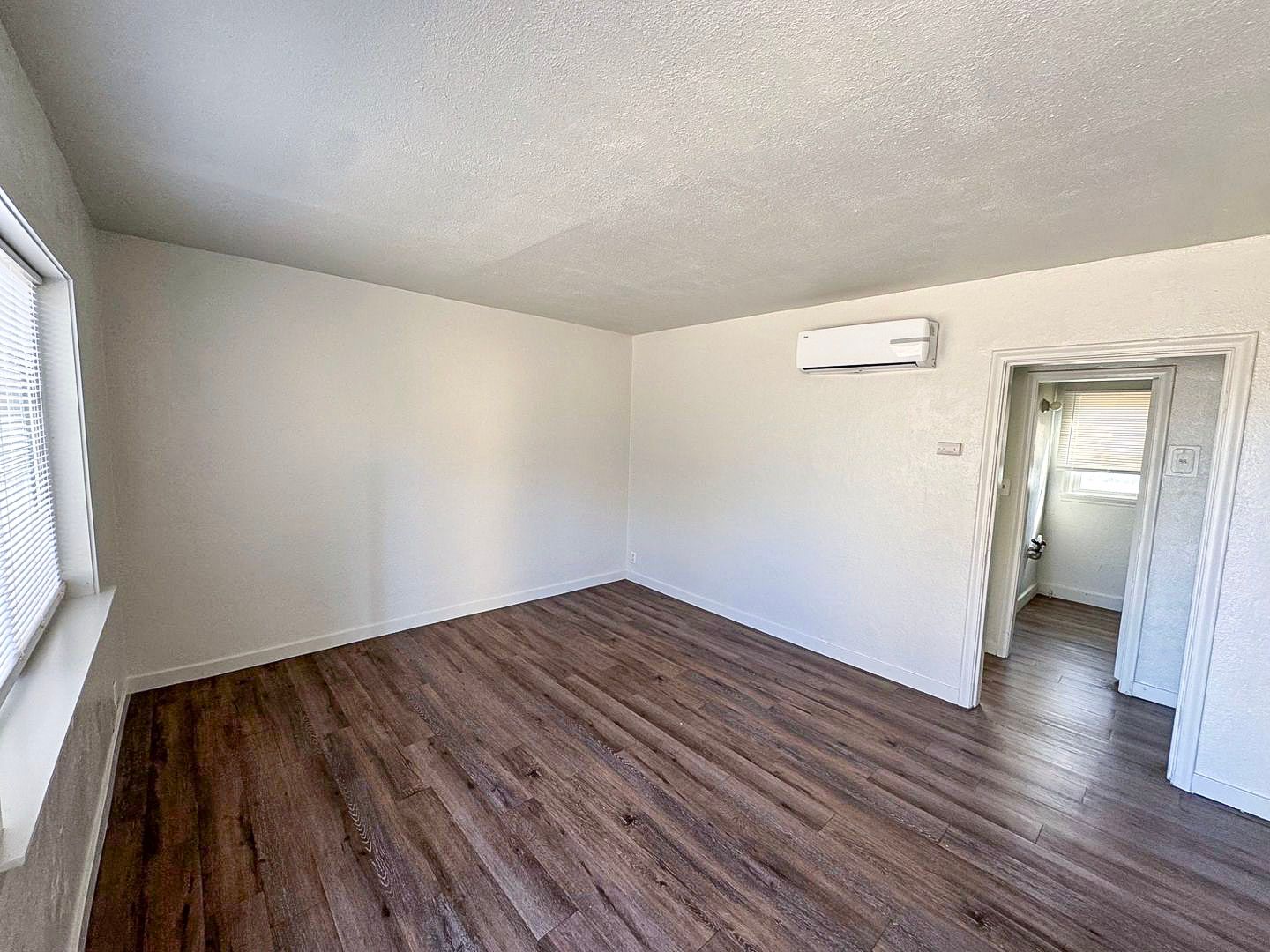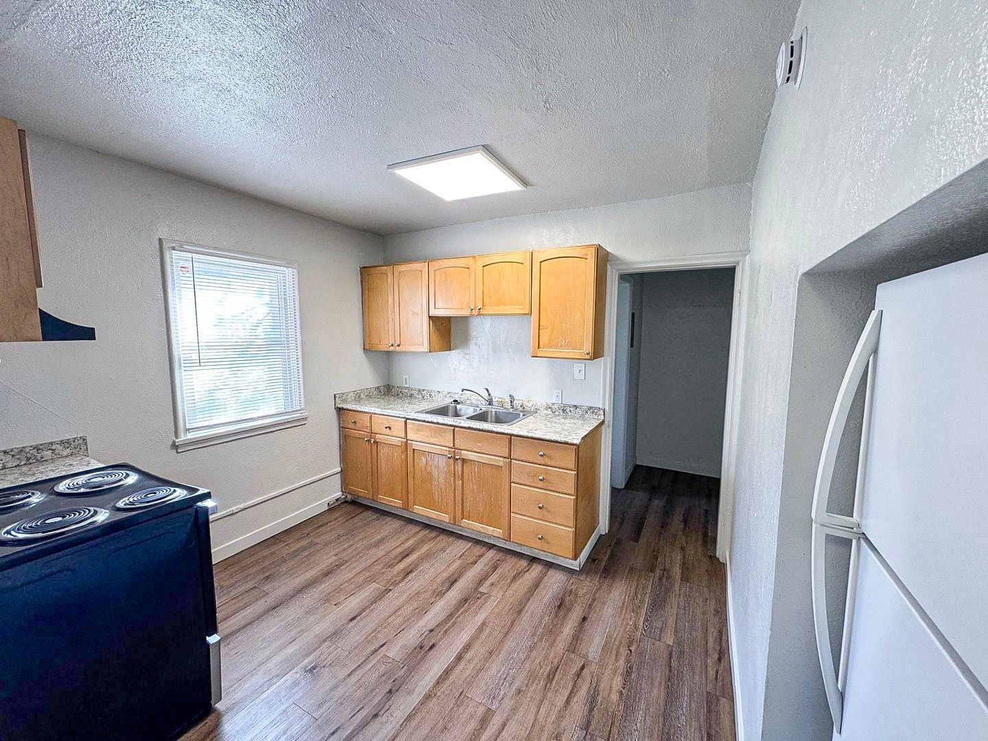 This charming home offers a spacious living area with large windows that fill the space with natural light. Wood-style flooring runs throughout, complemented by an energy-efficient ductless mini-split for heating and A/C. The full kitchen features an electric stove, refrigerator, double sink, and wood cabinetry with ample storage. A full bathroom with a walk-in shower completes the move-in-ready layout.